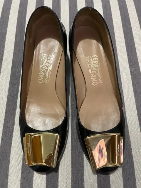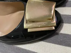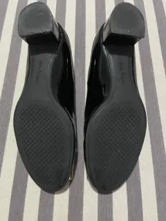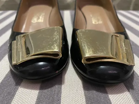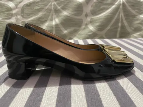 Hermosas zapatillas en color negro charol, con hebilla grande de n color dorado, tienen unas pequeñas ralladuras en la hebilla por el uso normal pero están súper cuidadas y son súper cómodas