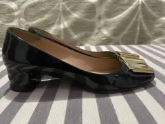 Zapatilla tacón bajo y ancho. Hermosas zapatillas en color negro charol, con hebilla grande de n color dorado, tienen unas pequeñas ralladuras en la hebilla por el uso normal pero están súper cuidadas y son súper cómodas