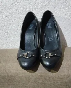 Zapatilla tacon de puente, marca Flexi, número 6 1/2, corte vacuno, forro sintético, suela sintética, plantilla cerdo, alto de tacon 9 cm, tiene pequeños detalles poco visibles en el tacon del pie izquierdo.