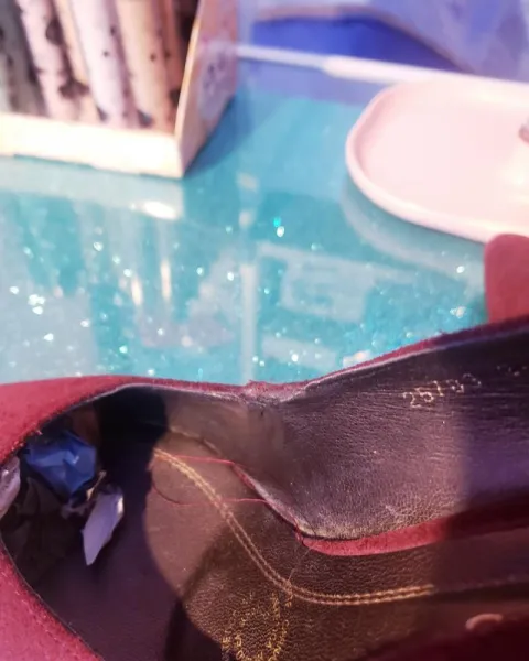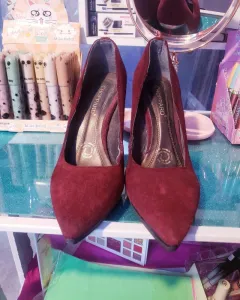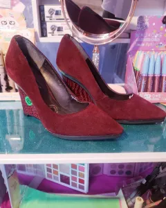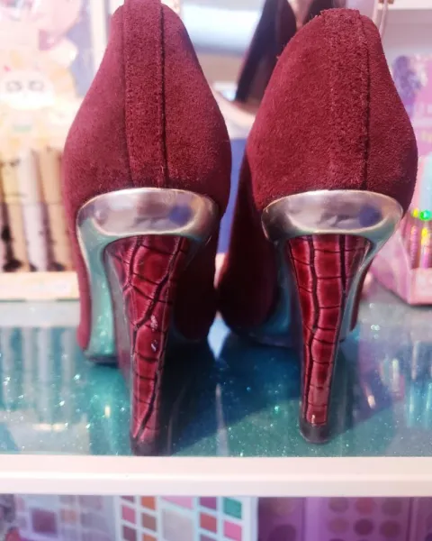 Zapatilla Vino de gamuza, tacón corrido talla 4.5 de uso con detalle en lateral de lado derecho, recibe de regalo sombra liquida de brillos en la compra de este producto