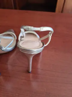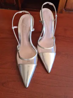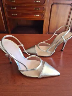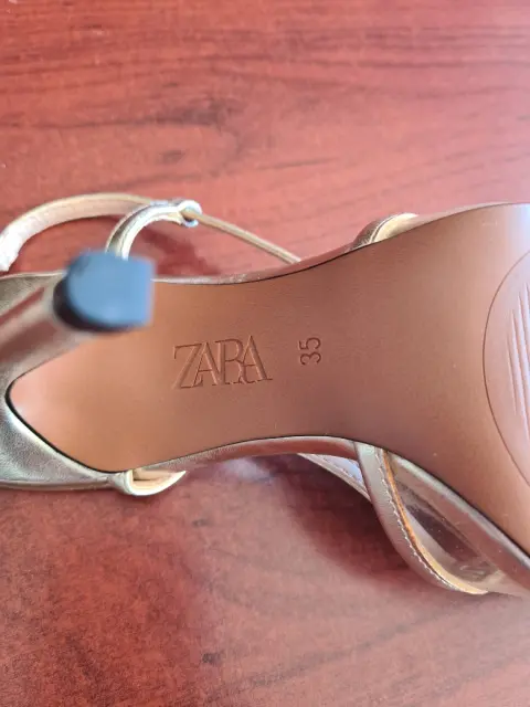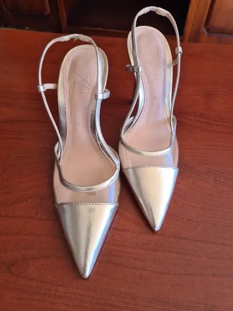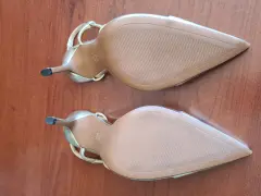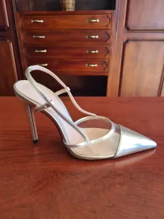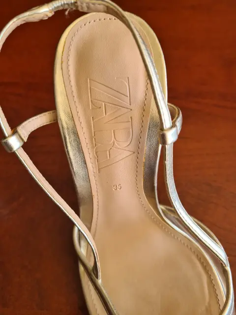 ZAPATILLA ZARA DE UN DORADO MUY TENUE, TACON AGUJA DEL NO. 10 , SIENTO QUE ESTAN REDUCIDAS A UNA TALLA 2.5 QUEDAN PERFECTAS Y A UNA TALLA 3 BIEN