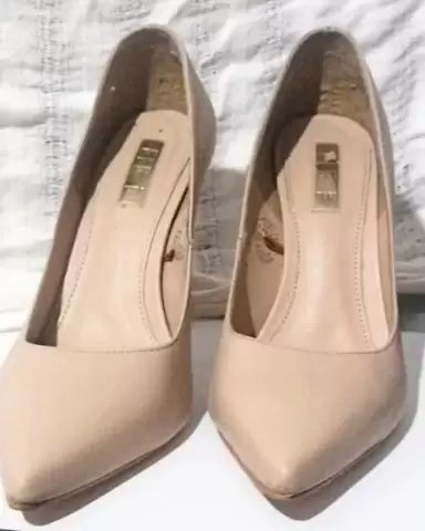 Elegantes zapatillas color beige talla 4, tacón de 10cm. Son un excelente complemento para tu outfit. Usados una sola vez, están en excelentes condiciones.