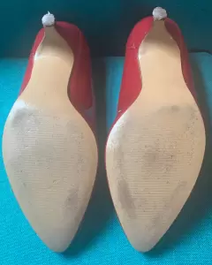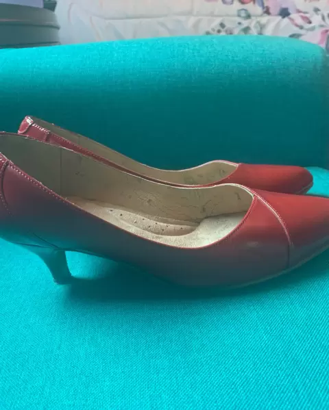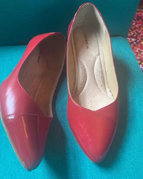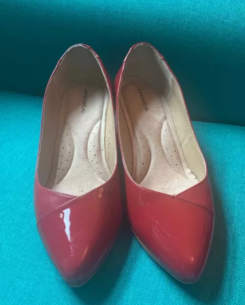 Zapatillas color rojo charol/piel, marca Andrea #4, pie derecho punta ligeramente tallada, en buen estado, interior confort para pie gordito, 4 cms. alto de tacón.
