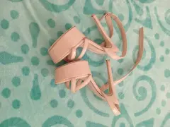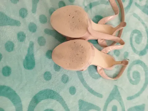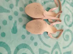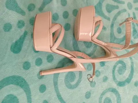 Zapatillas. Zapatillas de tiras y pulsera en tobillo, de charol color nude, tacon 15 centimetros