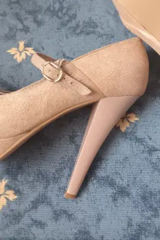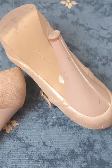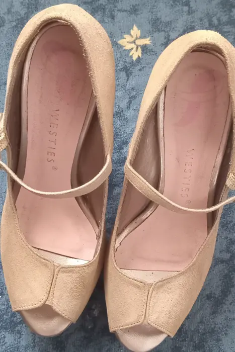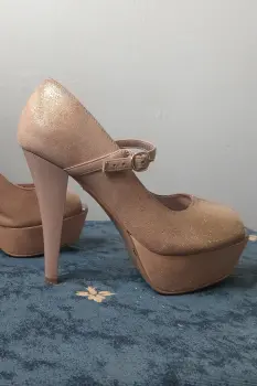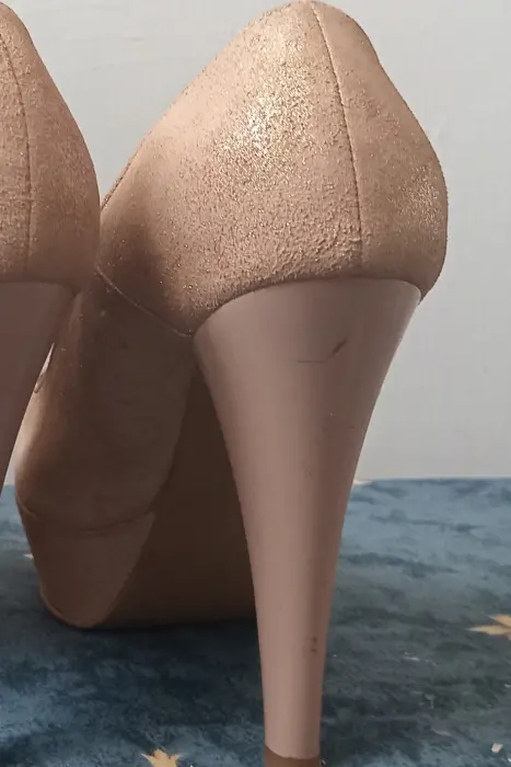 Zapatillas beige, con leve destello dorado 11 cm menos 3 de la plataforma , leve tallon en tacon como se ve en foto
