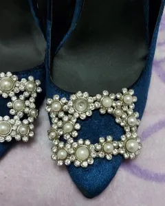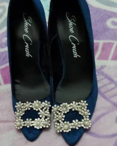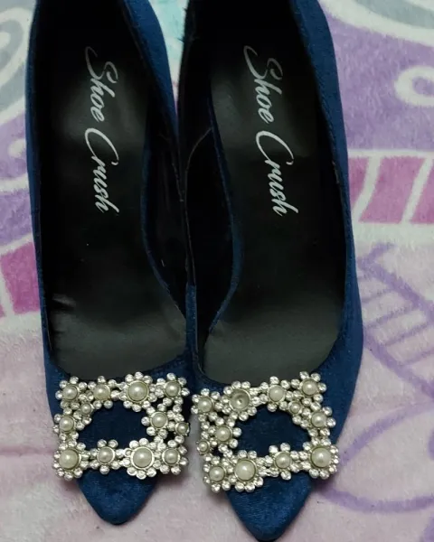 Lindas zapatillas azules con perlas en la hebilla la falta una perla como se ve en la segunda foto los pedí por Internet y así llegaron
