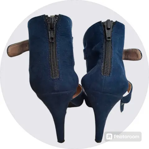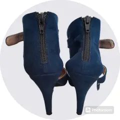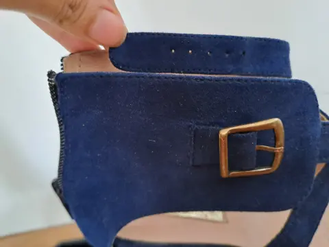 Zapatillas de gamusa color azul, con cierre y hebilla, número 4 pero considero que también quedan bien a un pie #5 siempre y cuando sea delgado, se encuentran en buen estado se puede ver en las zuelas.