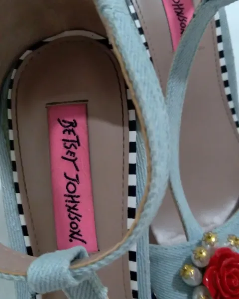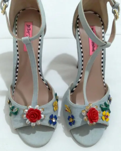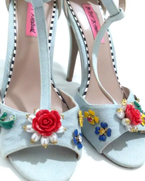 Zapatillas BETSEY JOHNSON. UNICAS / Zapatillas de mezclilla con aplicaciones florales / 1 Sola puesta / TALLA 25 fieles a su talla / Tacon 10 cm SIN DETALLES / EXCELENTE OPORTUNIDAD