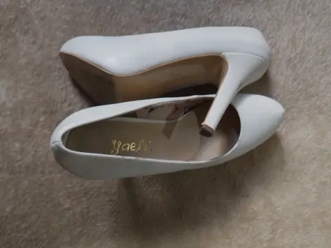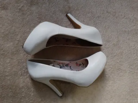 Zapatillas blancas. Talla 5, tacón de 10 cm, plataforma al frente, acojinado por dentro