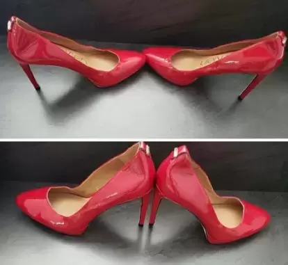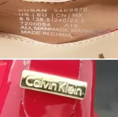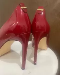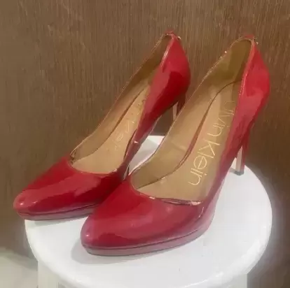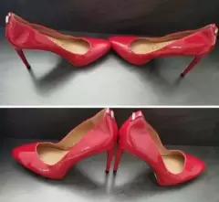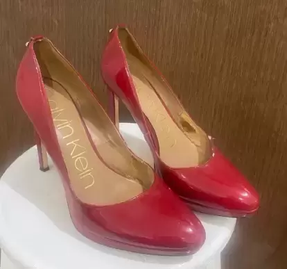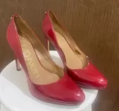Zapatillas de tacon Calvin Klein,modelo SUSAN, tipo charol, tacon del numero 11cm con pequeña plataforma de 1cm. color rojo intenso. Tiene detalles de uso, pero que se pueden mandar a arreglar con un zapatero.Precios negociables, pueden ofrecer!!