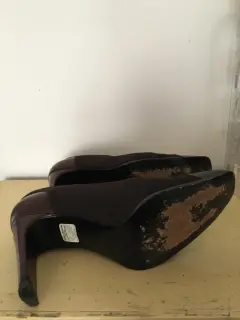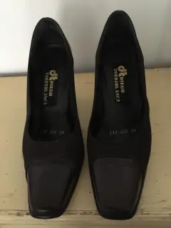 Zapatillas cerradas café. 7cm de alturaCafé oscuroTipo channelTallones leves en El tacón