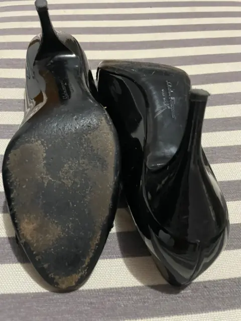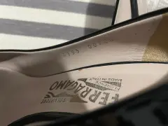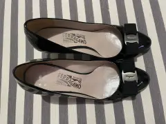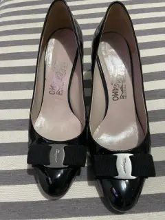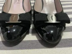 Zapatilla con moño y hebilla con el logo en color plateado, son de charol negro y están como nuevas, son de charol, el tacón es súper cómodo