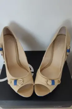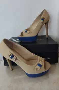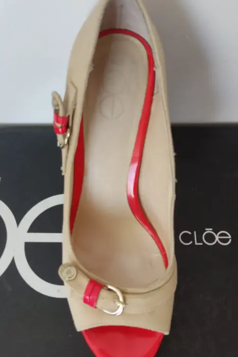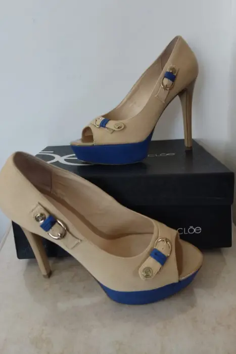 Zapatillas Cloé número 5 o 25, color Beige-Azul, Material: Sintético, Plataforma 3 cms, Tacón 13 cms, entrego con un par de tapas nuevas de repuesto y caja original.Zapatillas Cloé número 5 o 25, color Beige-Rojo, Material: Sintético, Plataforma 3 cms, Tacón 13 cms, entrego con un par de tapas nuevas de repuesto y caja original.