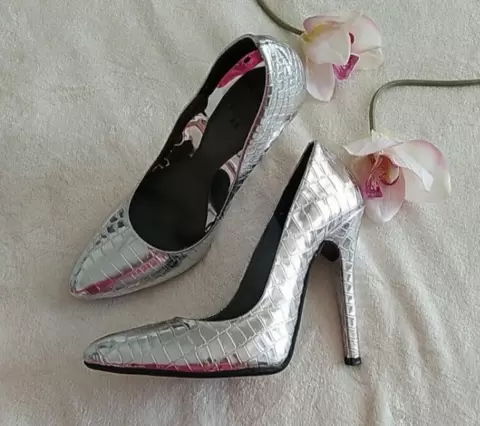 Bellisimas zapatillas cerradas color plateado muy brillante en material texturizado vinil