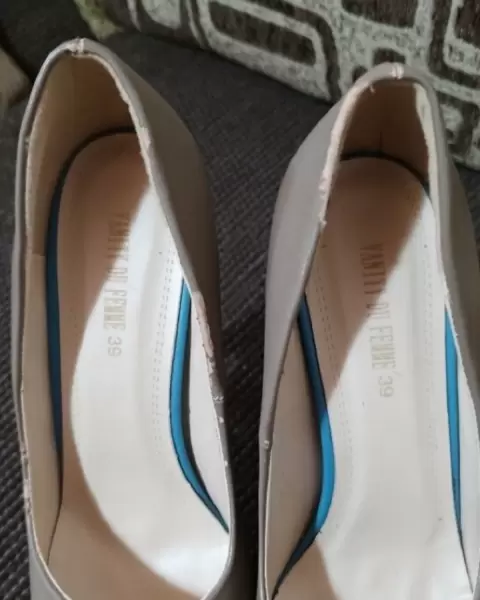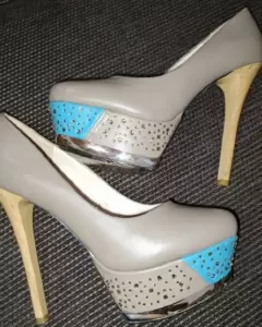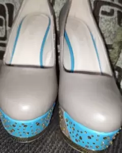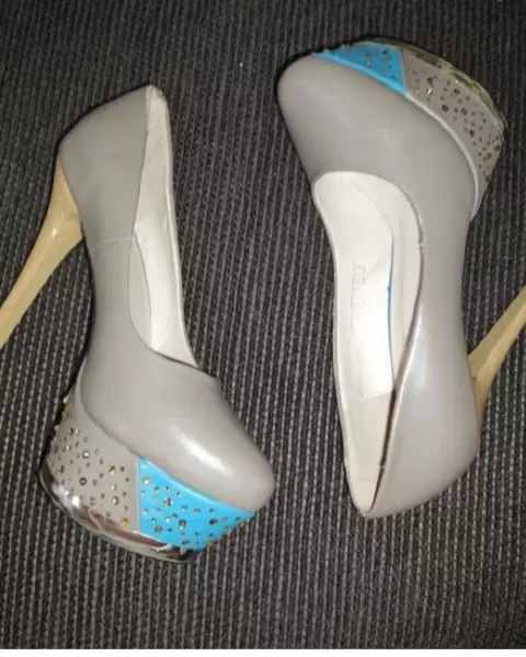 Zapatillas gris con azul tacón simulado de madera suela Antiderrapante nunca los use pero se pelearon de las orillas puestos no se les nota