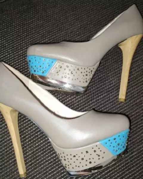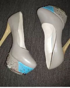Zapatillas con pedrería. Zapatillas gris con azul tacón simulado de madera suela Antiderrapante nunca los use pero se pelearon de las orillas puestos no se les nota