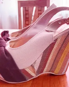 Zapatilla abierta con plataforma forrada, tela tipo mezclilla, usado en excelente estado. Plataforma de 11 cm