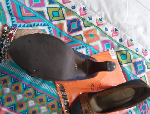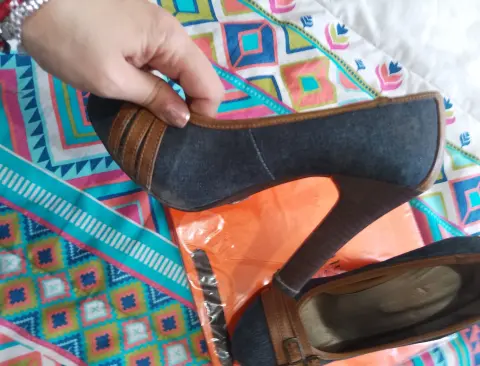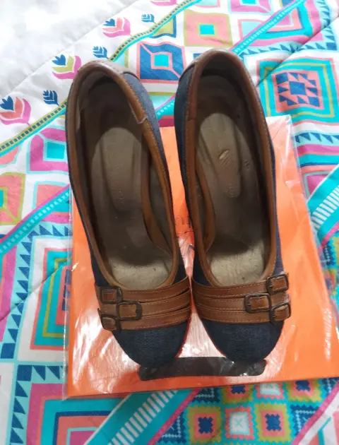 Zapatillas de mezclilla combinadas con color café , lucen muchísimo con tacón cuadrado numero 11
