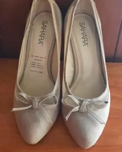 Zapatillas de moño. Zapatilla de gamuza, color beige, tacón de 7cm.