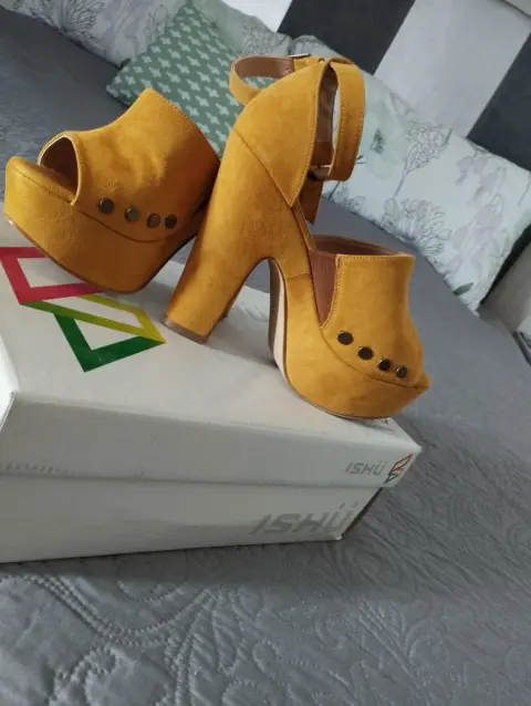 Zapatillas cómodas de plataforma, amarillo mostaza de gamuza, de semi uso, excelentes condiciones.