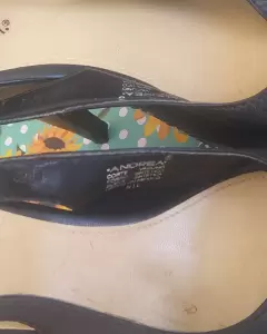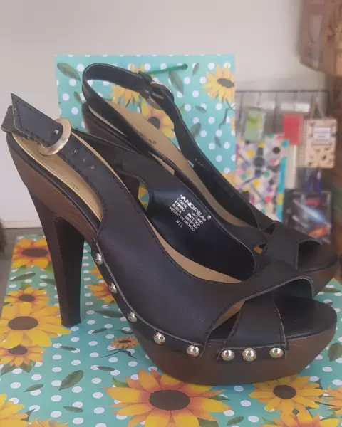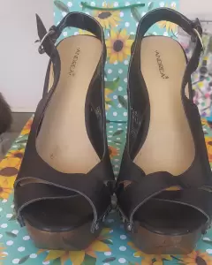 Zapatillas de plataforma y tacón delgado. Corté vacuno, forro sintético y suela sintética. Se usaron una vez se maltrato un poco la plantilla interna, no cuento con la caja. Tacón del 10. Se envía en caja reciclada.