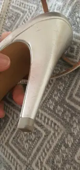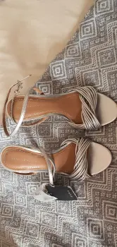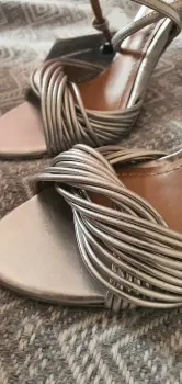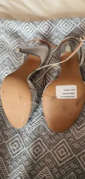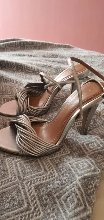 Zapatillas de tacon alto color plateadas. Tienen muchas tiras al frente. Están muy bonitas, son nuevas y con etiqueta pero si tienen algunos detalles, sobretodo en el tacón, son casi imperceptibles pero prefiero que los vean(ultima foto). Traen tapas de repuesto