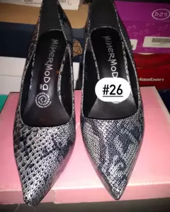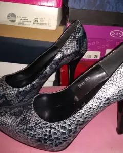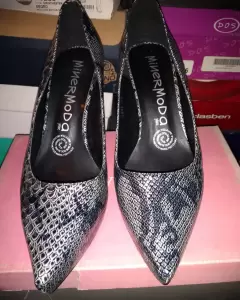 Elegantes zapatos, marca Minermoda, ideal para el trabajo o algun evento, tacón bajo, color gris-plata con negro. De 3 a 4 puestas.