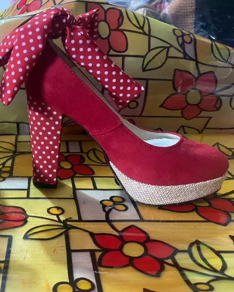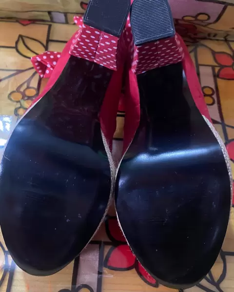 Zapatillas estilo Minnie. Lindas zapatillas rojas con moño y lunares en tacón, totalmente nuevas.Medida Tacón: 12cm.