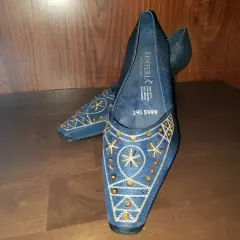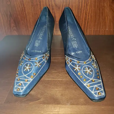 Zapatillas Felipe Renteria, azul marino, tacón 6, Von pedrería, número 24.5, en tela.