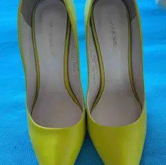 Super llamativas zapatillas color limón y tacon delgado y dorado, de la marca Andrea, tiene 10 cm de altura, el color es hermoso y muy vibrante.el tacon derecho tiene un pequeño raspón, pero es muy leve