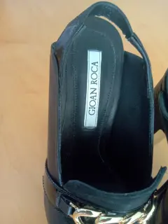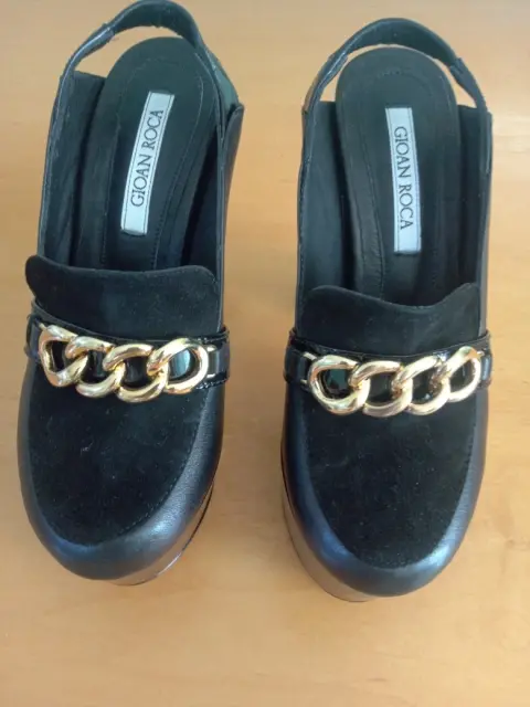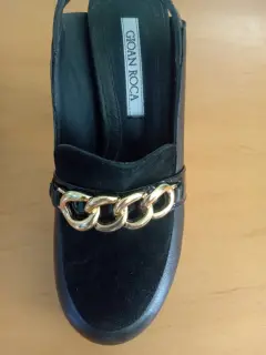 Zapatillas marca Gion Roca. Hermosas zapatillas negro con gamuza , Num. 2 con decorado en cadena color dorado Num. De tacón 12 cm