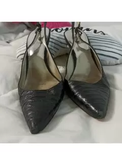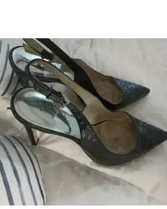 Zapatillas en color negro y logos en dorado ,ajuste con elástico y hebilla, placa de la marca colgando , descubiertos del talón cerrados de enfrente y terminación en punta ,en buen estado ,T/8 ame T/5 mex
