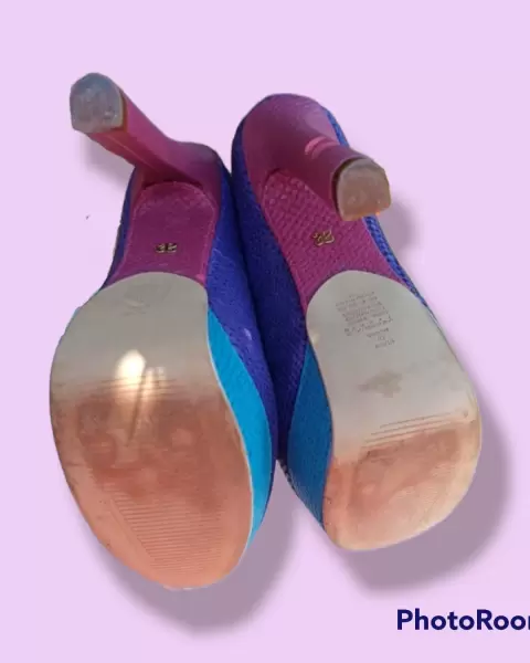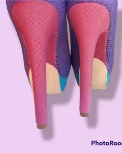 Zapatillas Multicolor. Zapatillas de piel, textura tipo serpiente, tacón de 15 cm, con plataforma, son del 3.5, pero quedan en 3, usados 2 o 3 veces, sin detalles.