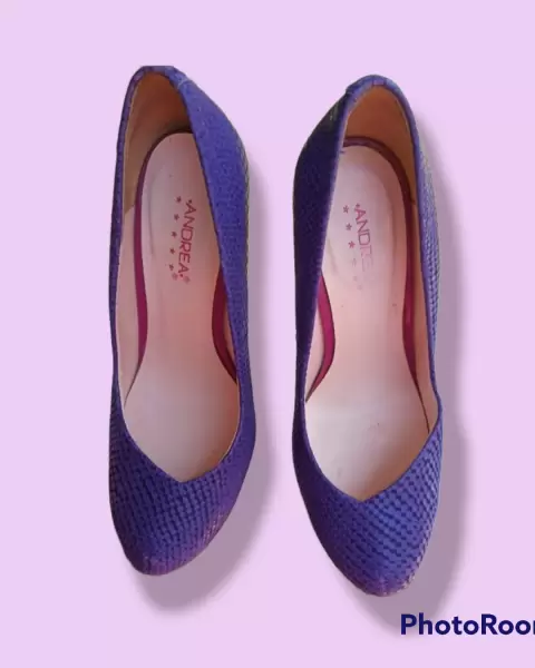 Zapatillas de piel, textura tipo serpiente, tacón de 15 cm, con plataforma, son del 3.5, pero quedan en 3, usados 2 o 3 veces, sin detalles.