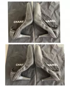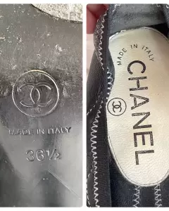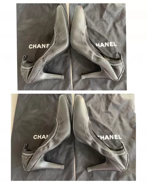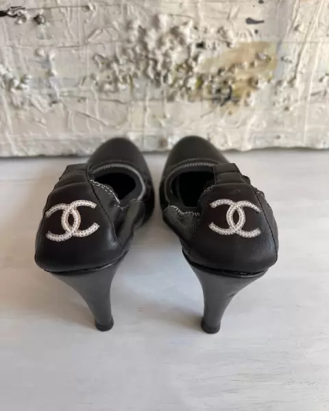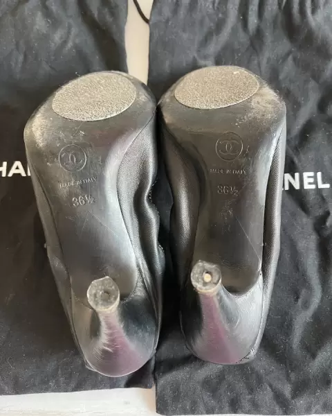 Zapatillas negras Chanel. Talla: 36.5 = 3.5 fieles a la talla. Creo que podrían quedar a 3 también.El tacón mide 8.5 cm.Se envían con cubrepolvo.Zapatillas de piel, han sido usadas y cuidadas.Han sido restauradas y Se les cambió la piel del tacón y la tapa, sin que afecte el uso. Las usaba con el protector de suela. Tienen detalles de uso que se ven en fotos.