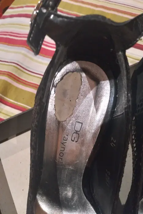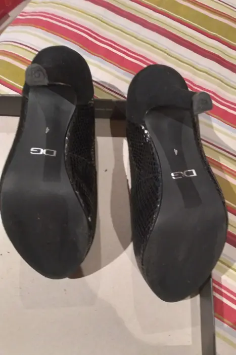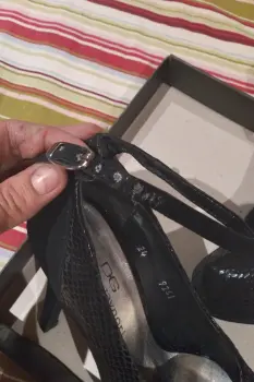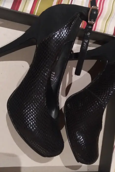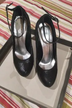 Zapatillas negras de 11 cm de tacón. Con plataforma de 2cm.Tienen 2 detalles: como tenían plantillas a la hora de quitarla se jaló la platilla del zapato también y los hoyitos de las correas como delgadas se hicieron algo feos los hoyitos