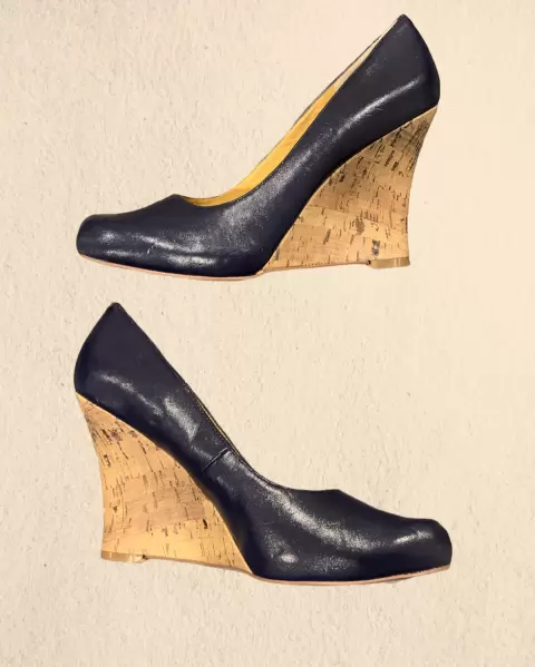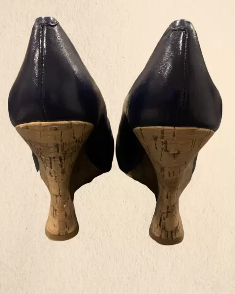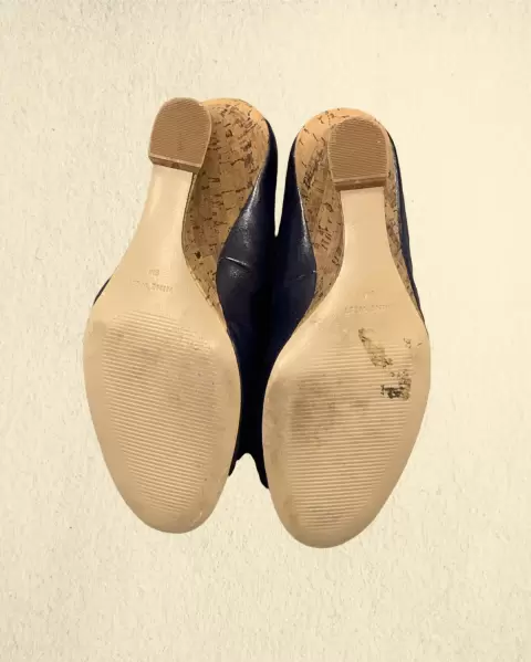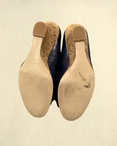 Zapatillas azul marino con tacón puente, de corcho, puestos una vez, la plantilla es muy suave, súper cómodas. Tiene unos detalles en el tacón. Llévatelas con regalo sorpresa ❤️