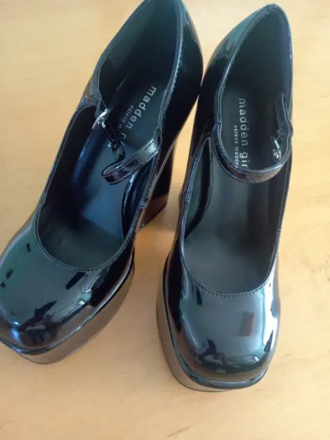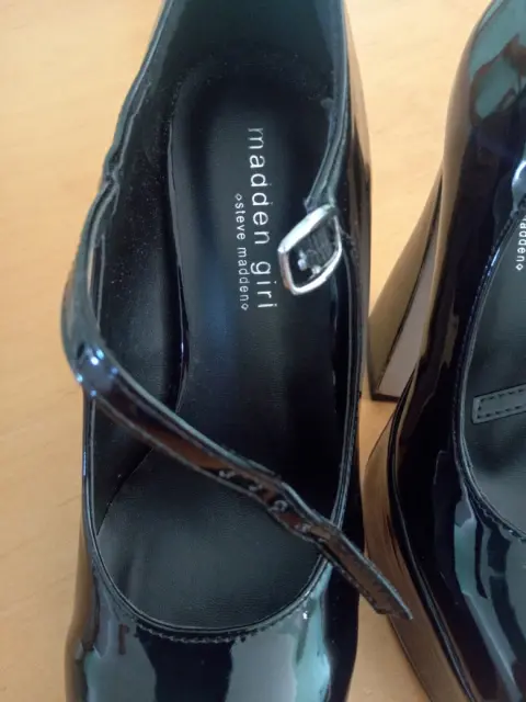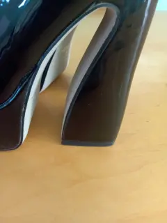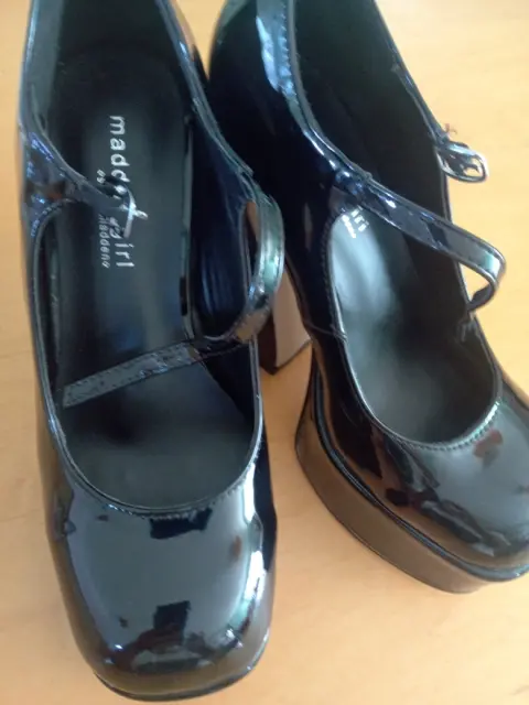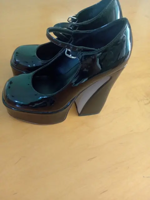 Zapatillas plataforma. Zapatillas de plataforma color negro de charol con correa tacón Num. 12.