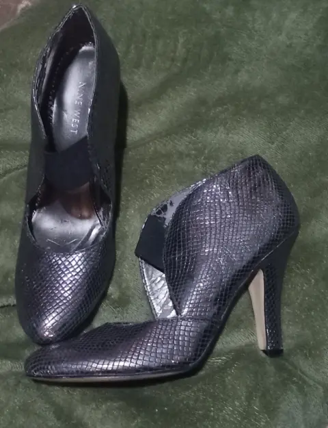 ZAPATILLAS PLATEADAS NINE WEST. Bonita zapatillas plateada con resorte negro en medio, tacon de 10 cm desgaste por dentro como se muestra en las imágenes