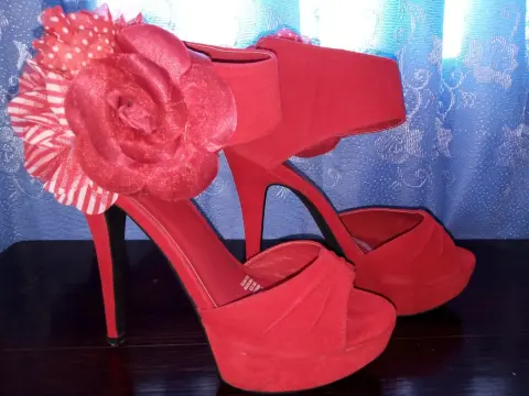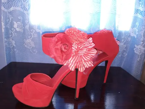 Zapatillas hermosas,color rojo,material aterciopelado. Detalle a un costado de la pulsera de otro material, talla 5 del tacón número 15.Están en perfectas condiciones, nuevas.