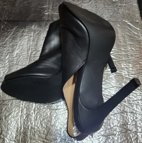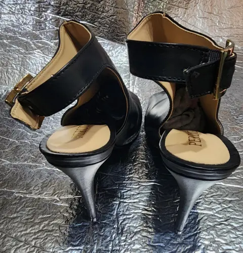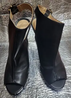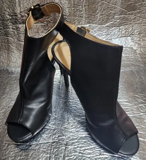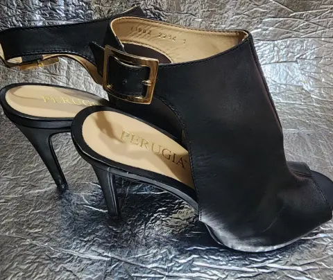Zapatillas punta abierta. Zapatilla color negroMarca PERUGIAPunta abiertaAltura de Tacón 11Corte VacunoForro y suela Sintética Talla 25Seminuevos, excelentes condiciones