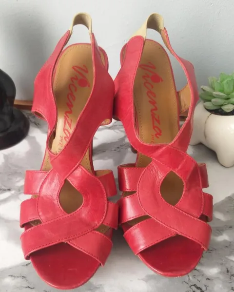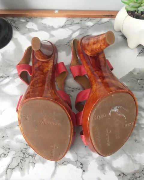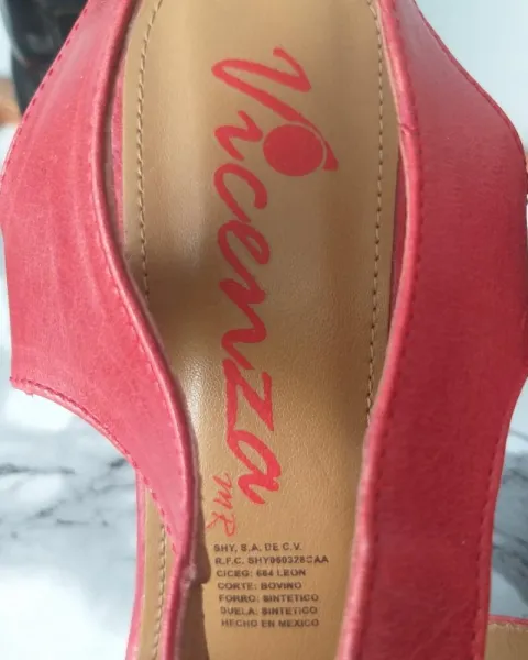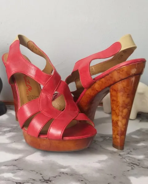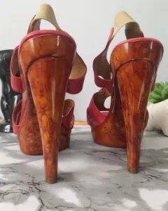 Zapatillas de plataforma (2cm) super comodas y bonitas, tacon de 12 cm en color marmol café, estan hermosas, el corte es en piel vacuno color rojo, bonito diseño. Sin detallesEn su punto 25.5Estan nuevas, aun se ve la marca de los stickers en la suela de protección.
