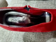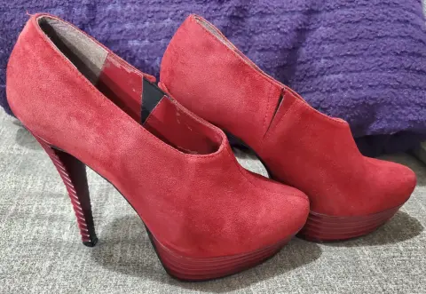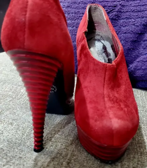 Zapatillas rojas. Zapatillas de tacón alto, tipo de tela "ante" o "gamuza", rojo brillante, muy cómodas.