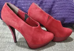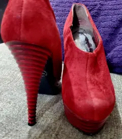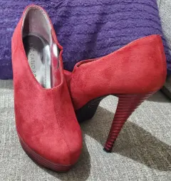 Zapatillas de tacón alto, tipo de tela "ante" o "gamuza", rojo brillante, muy cómodas.