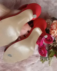 Hermosas zapatillas Rojas ♥️Son abiertas y de chaquiron, son bajitas su tacon mide 9.5 cm y su material es tipo gamusa.Marca: AndreaSe usaron como unas 8 veces ✨Talla: 4.5
