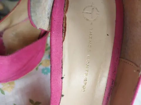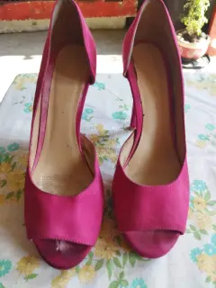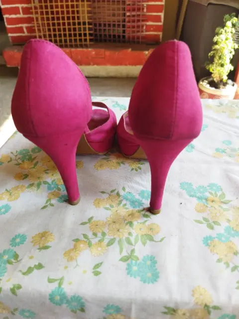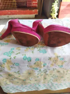 Zapatillas rosas de tacón con altura de 12cm., perfecto estado, sin daños. Punta descubierta, algo sucias.