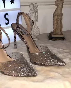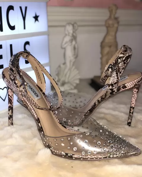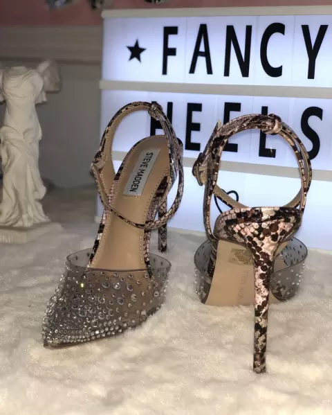 Zapatillas Steve Madden, con detalles en pedrería imitación diamante y animal print víbora rosa. Talla 5Mx. Tacón tamaño 12cm.