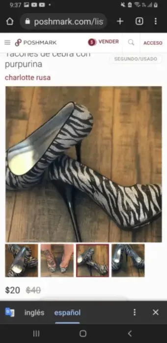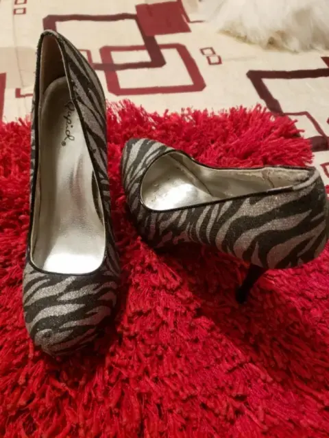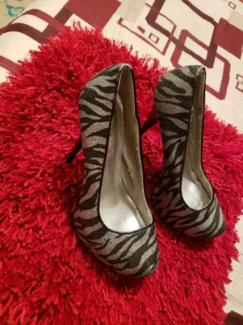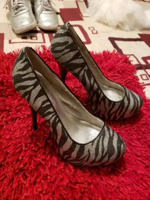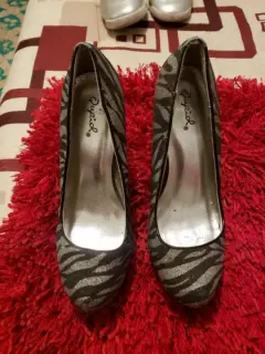 Diseño de cebra una plataforma tacon tipo aguja excelente estado el tacon diseño de cebra con gliter tiene detalles de uso que no afecta ni su usar ni su imagen estan en bue. Estado 50 porciento de vida 💛 4.5 número