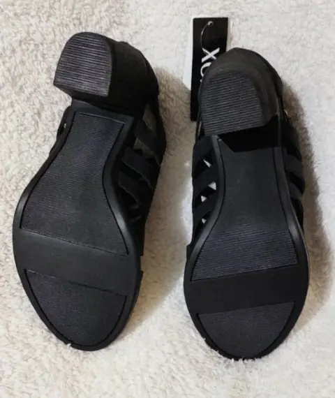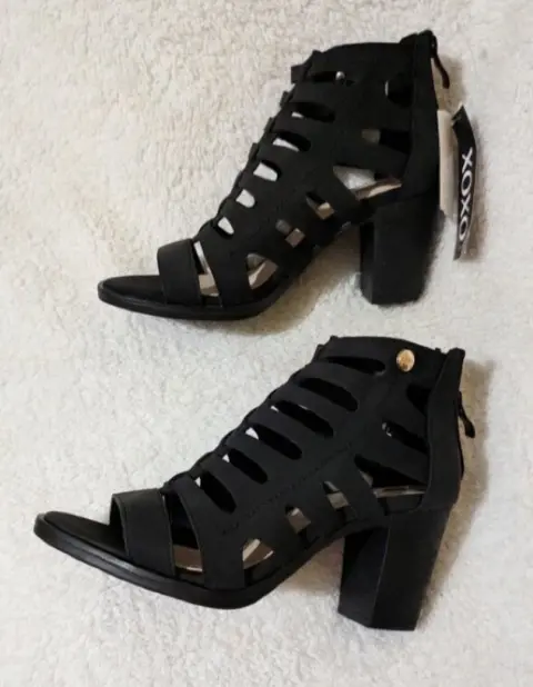 Zapatillas Xoxo negras. Hermosa zapatilla color Negra de material resistente al agua, diseño elegante perforado con cierre atrás, estilo tiras romanas, suela antiderrapante, altura tacón de 8cm. México Número #25.5cm. Pregúntame o visita mi closet para más modelos y numeración. En tu primer compra dentro de la app se te descuenta -$ usa mi código Promocional Copia y pega: lucyrmxXqQJ9