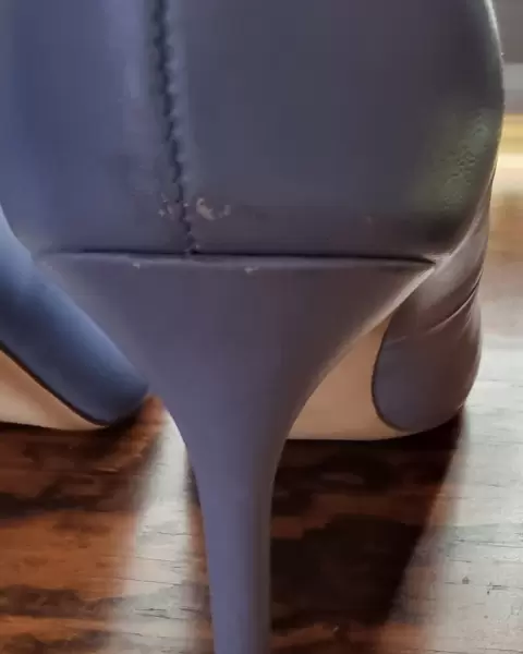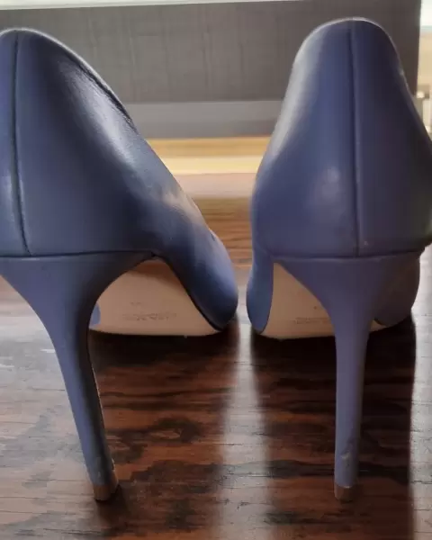 Zapatillas fabricadas en piel, color azul plumazo o lavanda.Tacones de 4", corte de piel, forro piel, suela sintética. Usados 1 sola vez, calzado elegante en un color muy alegre y combinable.Tiene pequeños detalles en un tacón, que se observan en la 2a. fotografía, debido a que han permanecido mucho tiempo entre otros zapatos, sin embargo, el interior está impecable.
